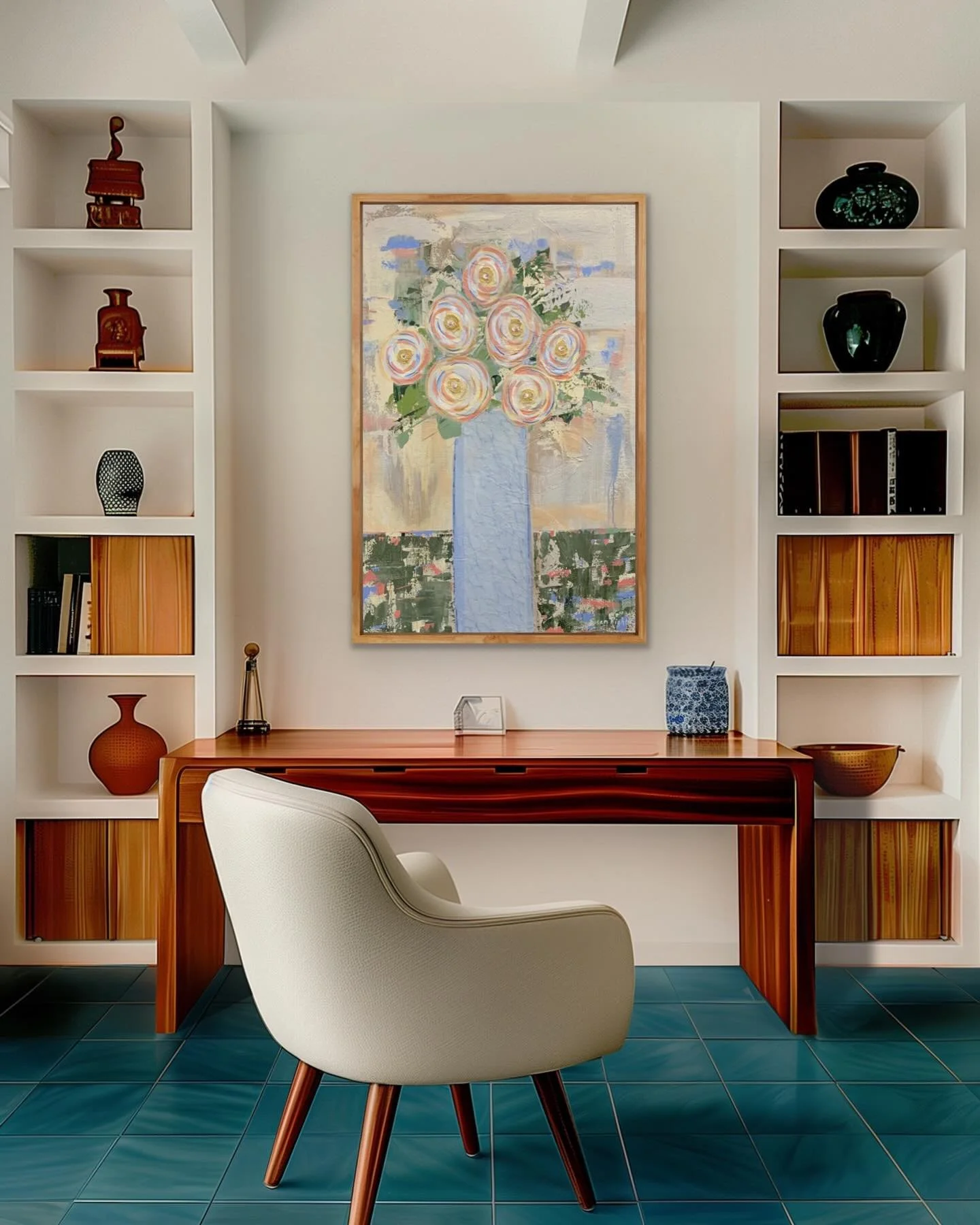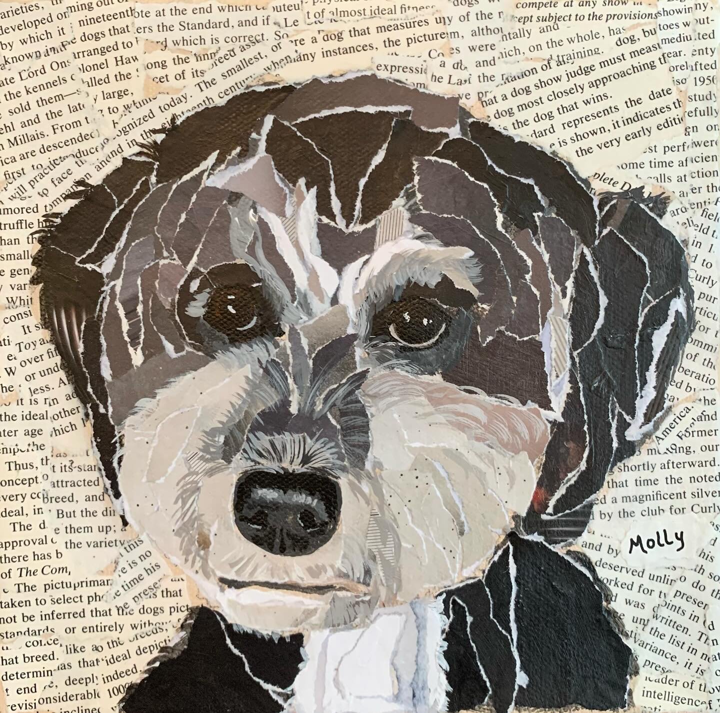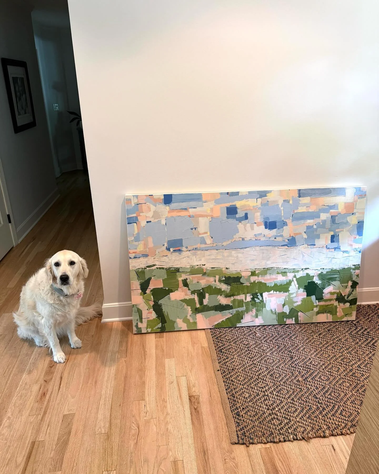 Selecting the right artwork is very personal, and when you find the right piece, you know it! I offer a selection of “ready to ship” paintings through my shop, and I release new collections throughout the year. Commissions for special art pieces—such as large statement pieces or my mini pet collages are open, too.